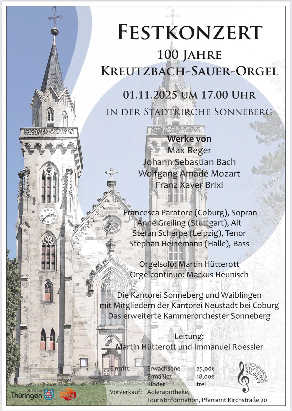 Die Feierlichkeiten zum Fest „100 Jahre Kreutzbach-Sauer-Orgel“ in der Stadtkirche Sonneberg werden nunmehr am Sonntag, 09.11. um 17.00 gekrönt durch das Orgelgalakonzert mit Imbiss, bei dem der renommierte Orgelprofessor aus Hamburg, Wolfgang Zerer am Instrument zu hören sein wird.