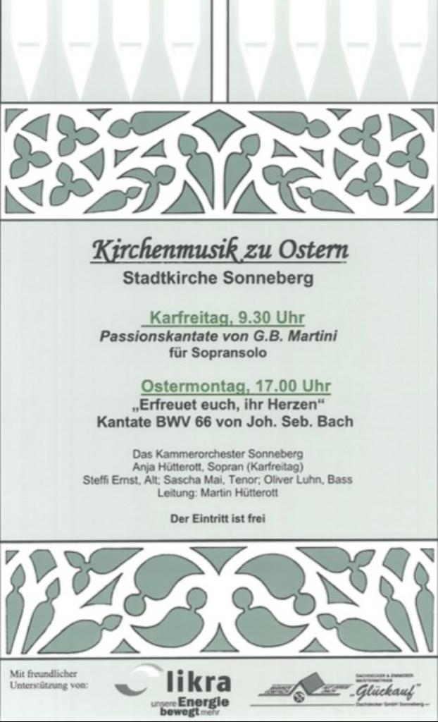 Am 02.04. (Kilianskirche Effelder), 09.04. (St. Peter und Paul Basilika Steinach) und 10.04. (Stadtkirche Sonneberg), jeweils um 17 Uhr, singt die Kantorei Sonneberg unter der Leitung von Kreiskantor Martin Hütterott die Matthäuspassion aus dem Jahr 1665 von Heinrich Schütz.