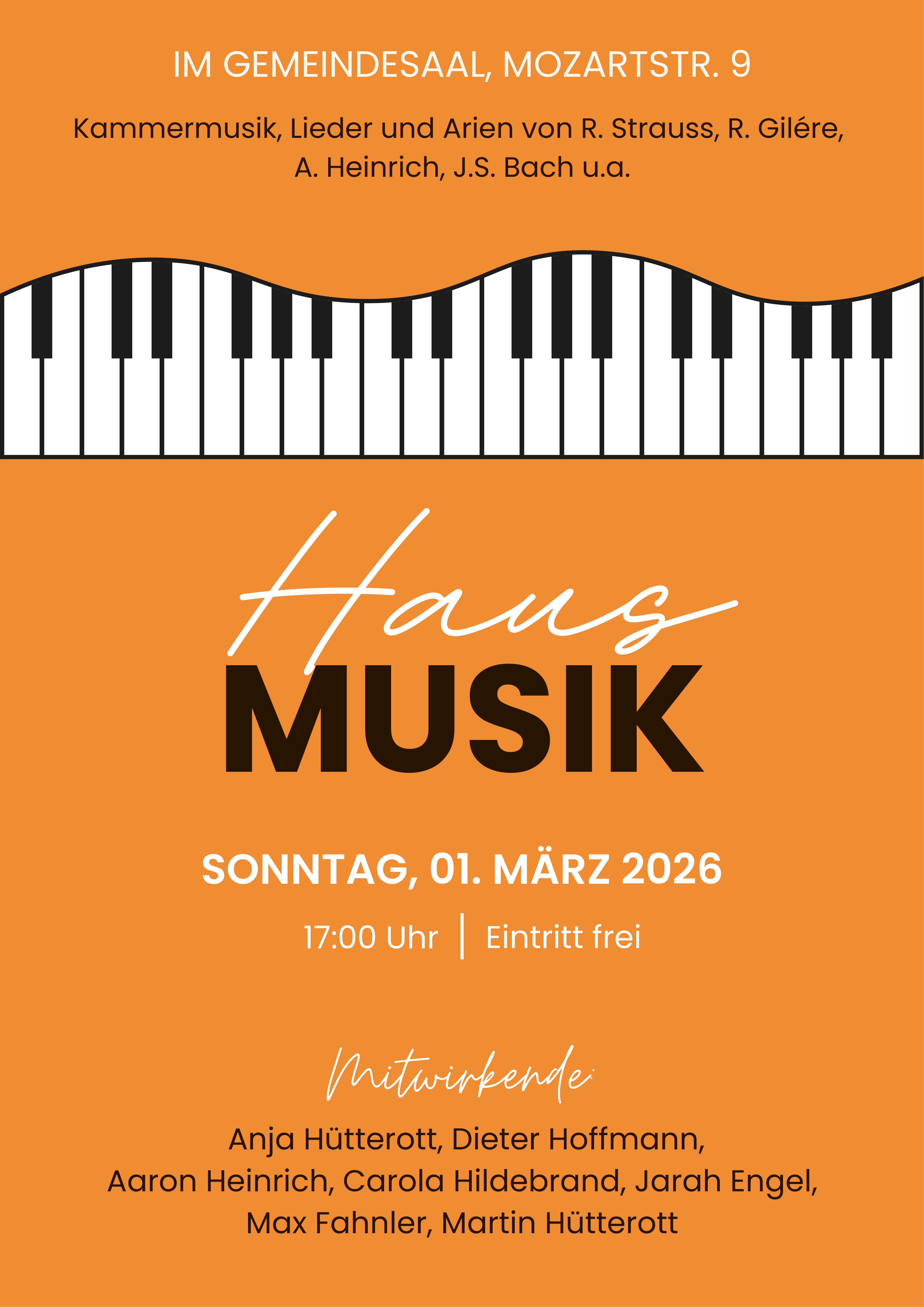 Am Sonntag, 01.03. findet wieder die beliebte Hausmusik um 17 Uhr im Gemeindesaal der Stadtkirchengemeinde (Mozartstr. 9) statt. Ein bunter Reigen mit Mitgliedern des Sonneberger Kammerorchesters und dem Kammermusiktrio der Musikschule erwartet die Musikfreunde: